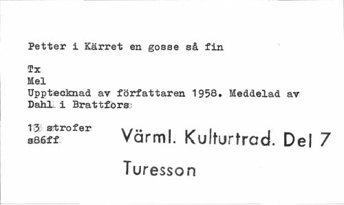 //// Petter i Kärret en gosse så fin //// Tx Mel //// Upptecknad av författaren 1958. Meddelad av Dahl i Brattfors- //// s86ff " Vä rml. Kulturtrad. Del 7 Turesson ////