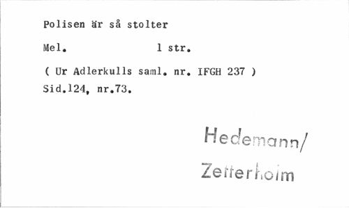 //// Polisen är så stolter //// Mel. 1 str. //// ( Ur Adlerkulls saml. nr. IFGH 237 ) Sid.124, nr.73. //// He derna nn/ Ze tre r ho i m ////