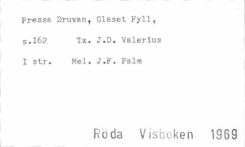 //// Pressa Druvan, Glaset Fyll, s.162 Tx. J.D. Valerius //// I str. Mel. J.F. Palm //// Röda Visboken 1989 ////