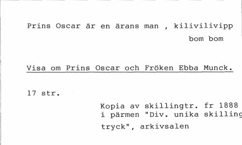 //// Prins Oscar är en ärans man , kilivilivipp //// bom bom //// Visa om Prins Oscar och Fröken Ebba Munck. 17 str. //// Kopia av skillingtr. fr 1888 i pärmen "Div. unika skillini //// tryck", arkivsalen ////