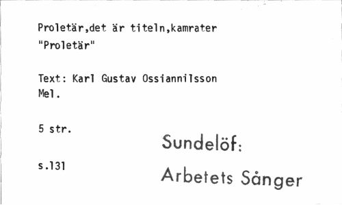 //// Proletär,det är titeln,kamrater "Proletär" //// Text: Karl Gustav Ossiannilsson Mel. //// 5 str. //// Sundelöf: S'131 Arbetets Sånger ////