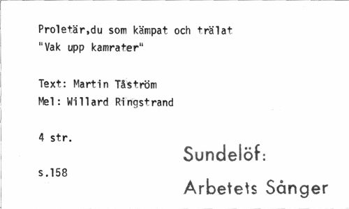 //// Proletär»du som kämpat och trälat "Vak upp kamrater" //// Text: Martin Tåström Mel: Willard Ringstrand //// 4 str. //// Sundelöf: //// s .158 //// ArbeteU Sånger ////