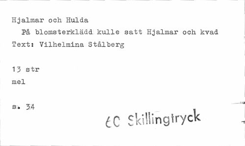 //// Hjalmar och Hulda //// På blomsterklädd kulle satt Hjalmar och kvad Texts Vilhelmina Stålberg //// 13 str mel //// s. 34 . //// t C SkiHingtryck ////