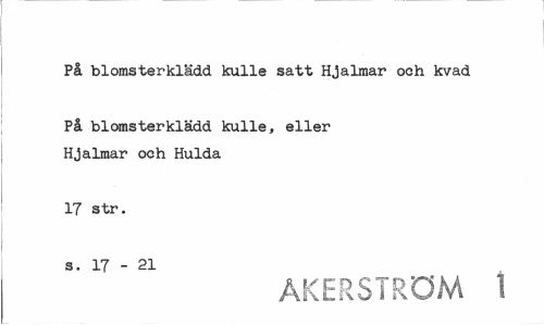 //// På blomsterklädd kulle satt Hjalmar oeh kvad //// På blomsterklädd kulle, eller Hjalmar och Hulda //// 17 str. //// s. 17-21 //// ÅKERSTRÖM 1 ////