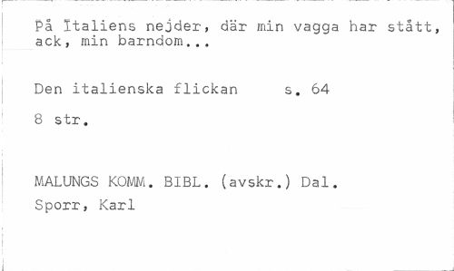 //// På Italiens nejder, där min vagga har stått, ack, min barndom... //// Den italienska flickan s. 64 8 str. //// MALUNGS KOMM. BIBL. (avskr.) Dal. Sporr, Karl ////