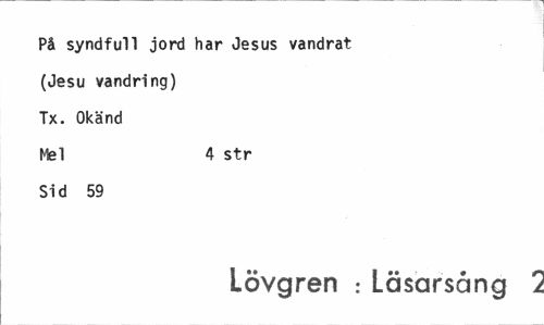 //// På syndfull jord har Jesus vandrat (Jesu vandring) Tx. Okänd //// Mel 4 str //// Sid 59 //// Lövgren : Läsarsång i ////