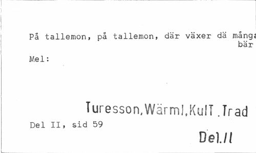 //// På tallemon, på tallemon, där växer dä mång //// bär //// Mel: //// Turesson,Wärml.KulI .Trad //// Del II, sid 59 //// Del. U ////