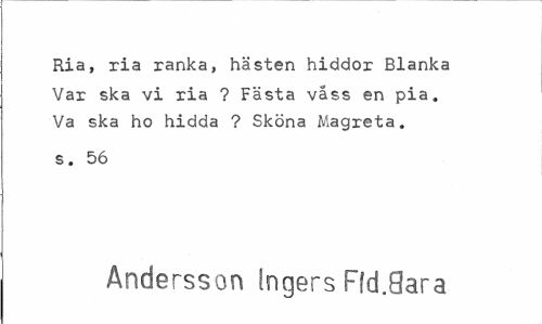 //// Ria, ria ranka, hästen hiddor Blanka Var ska vi ria ? Fästa vass en pia. Va ska ho hidda ? Sköna Magreta, //// s. 56 //// Andersson Ingers Fld.8ara ////