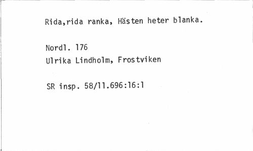 //// Rida,rida ranka, Hästen heter blanka. Nordl. 176 //// Ulrika Lindholm, Frostviken SR insp. 58/11.696:16:1 ////