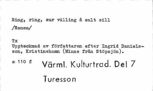 //// King, ring, sur välling å salt sill /Ramsa/ //// Tx //// Upptecknad av författaren efter Ingrid Danielsson, Kristinehamn (Minne frän Stöpsjon). //// s 110 f Värm!. Kulturtrad. Del 7 Turesson ////