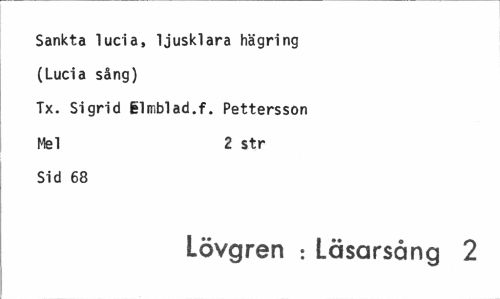 //// Sankta lucia, ljusklara hägring (Lucia sång) //// Tx. Sigrid glmblad.f. Pettersson Mel 2 str //// Sid 68 //// Lövgren Läsarsång 2 ////
