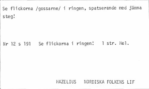 //// Se flickorna /gossarne/ i ringen, spatserande med jämna steg! //// Nr 12 s 191 Se flickorna i ringen! 1 str. Mel. //// HAZELIUS NORDISKA FOLKENS LIF ////