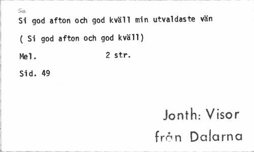 //// Si god afton och god kväll min utvaldaste vän ( Si god afton och god kväll) Mel. 2 str. //// Sid. 49 //// Jonth: Visor från Dalarna ////
