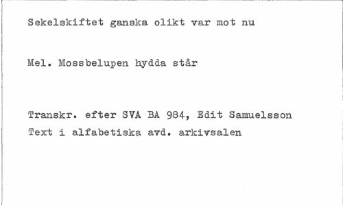 //// Sekelskiftet ganska olikt var mot nu Mel. Mossbelupen hydda står //// Transkr. efter SVA BA 984, Edit Samuelsson Text i alfabetiska avd. arkivsalen ////