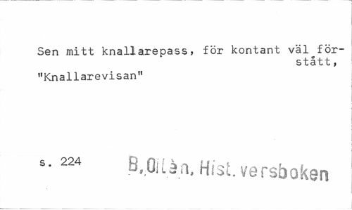 //// Sen mitt knallarepass, för kontant väl^förstått , //// "Knallarevisan" //// B.OUén. Hist. versboken ////