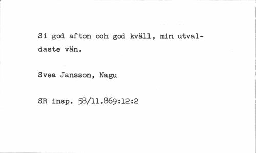 //// Si god afton och god kväll, min utvaldaste vän. //// Svea Jansson, Nagu //// SR insp. 58/11.869:12:2 ////