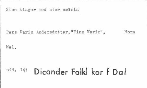 //// Sion klagar med stor smärta //// Pers Karin Andersdotter, "Finn Karin", Mora //// Mel. //// sid. 141 Dicander Folkl kor f Dal ////