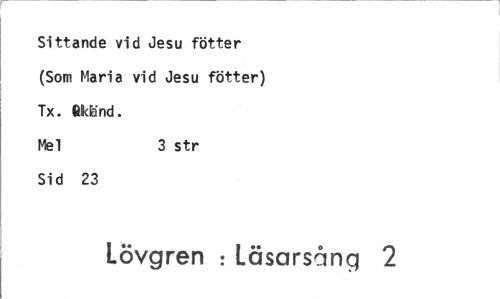 //// Sittande vid Jesu fötter (Som Maria vid Jesu fötter) Tx. Gkländ. Mel 3 str //// Sid 23 //// Lövgren : Läsarsång 2 ////
