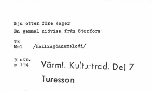 //// Sju otter före dager //// En gammal nidvisa från Storfors //// Tx //// Mel /Hallingdansmelodi/ 3 str. //// b 114 Värml. Kj fj. trcd. Del 7 Turesson ////