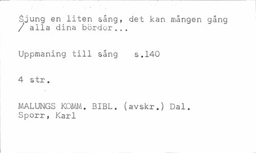 //// Sjung en liten sång, det kan mången gång / alla dina bördor... //// Uppmaning till sång s.140 //// 4 str. //// MALUNGS KOMM. BIBL. (avskr.) Dal. Sporr, Karl ////
