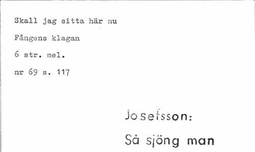 //// Skall jag sitta här nu Fångens klagan 6 str. mel. nr 69 s. 117 //// Jo setsson: Så sjöng man ////