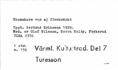 //// Skomakare var eg förskräckt //// Uppt. Gertrud Eriksson 1929* Med» av Olof Nilsson* Norra Nolby, Jrykerud ULMA 2370 //// Ls?36 Värm!. Ku tj. trcd. Del 7 Turesson ////