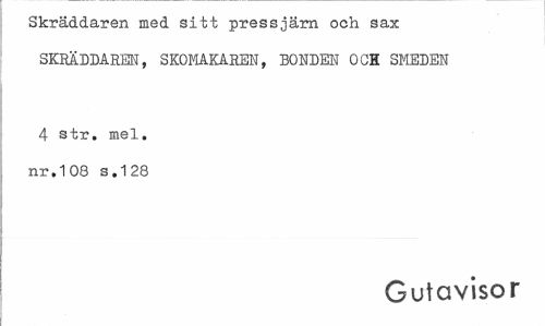 //// Skräddaren med sitt pressjärn och sax SKRÄDDAREN, SKOMAKAREN, BONDEN OCH SMEDEN //// 4 str. mel. nr.108 s.128 //// Gutavisor ////