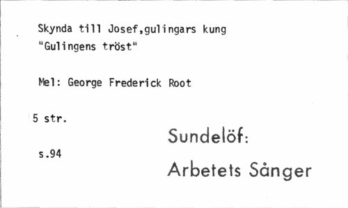 //// Skynda till Josef,gulingars kung "Gulingens tröst" //// Mel: George Frederick Root //// 5 str. //// Sundelöf: //// s .94 //// Arbetets Sånger ////
