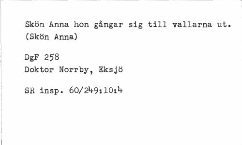 //// Skön Anna hon gångar sig till vallarna ut. (Skön Anna) //// DgF 258 //// Doktor Norrby, Eksjö SR insp. 60/2*4-9:10:*+ ////