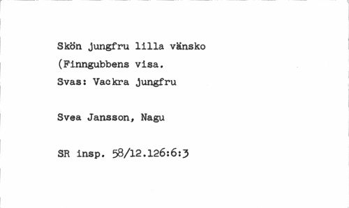 //// Skön jungfru lilla vänsko (Finngubbens visa. Svas: Vackra jungfru //// Svea Jansson, Nagu //// SR insp. 58/12.126:6:3 ////