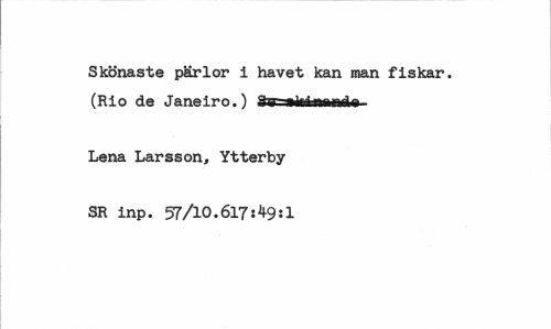 //// Skönaste pärlor i havet kan man fiskar. (Rio de Janeiro.) Tnr iklhihh.Ui //// Lena Larsson, Ytterby //// SR inp. 57/10.617:^9:1 ////