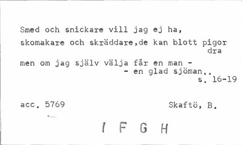 //// Smed och snickare vill jag ej hä, //// skomakare och skräddare,de kan blott pigor //// dra //// men om jag själv välja far en man - //// - en glad sjöman.. //// s. 16-19 //// acc. 5769 Skaftö, B. //// t F G H ////