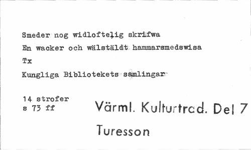 //// Smeder nog widlofte^ig skrifwa //// En wacker och wälstäldt hammarsmedswisa //// Tx //// Kungliga Bibliotekets samlingar-14 strofer //// s 73 ff Värml. Kulturtrccl. Del 7 Turesson ////