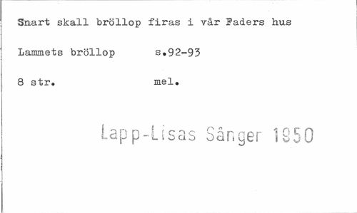 //// Snart skall bröllop firas i vår Faders hus Lammets bröllop s.92-93 //// 8 str. mel. //// Lapp-Lisas Sånger 1850 ////