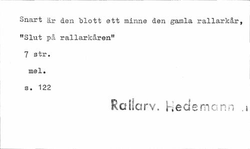 //// Snart är den "blott ett minne den gamla rallarkår, "Slut på rallarkåren" 7 str. mel. s. 122 //// Rciiiarv. Hedemonn . ////