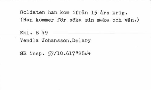 //// Soldaten han kom ifrån 15 års krig. (Han kommer för söka sin maka och vän.) //// Ekl. B //// Vendia Johansson,Delary SR insp. 57/10.617"28-A ////
