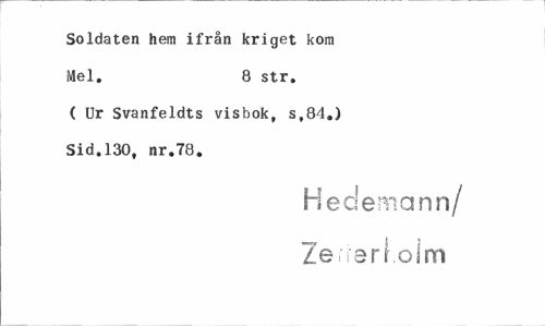 //// Soldaten hem ifrån kriget kom Mel. 8 str. //// ( Ur Svanfeldts visbok, s,84.) Sid.130, nr.78. //// Hedernann/ Zerierl oim ////