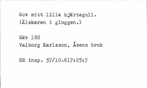 //// Sov mitt lilla hjärtegull. (Ålskaren i gluggen.) //// Skv 188 //// Valborg Karlsson, Åsens bruk SR insp. 57/10.617*.25**7 ////