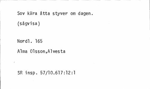 //// Sov kära åtta styver om dagen, (sågvisa) //// Nordl. 165 //// Alma Olsson,Alvesta //// SR insp. 57/10.617:12:1 ////