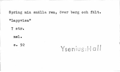 //// Spring min snälla ren, över berg och fält. "Lappvisa" 7 str. mel. //// s' 92 w . |! //// Ysemu$:Han ////