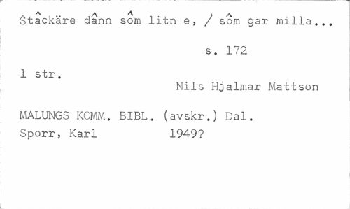 //// Stackare dånn som litn e, / som gar milla... //// s. 172 //// 1 str. //// Nils Hjalmar Mattson //// MALUNGS KOMM. BIBL. (avskr.) Dal. Sporr, Karl 1949? ////