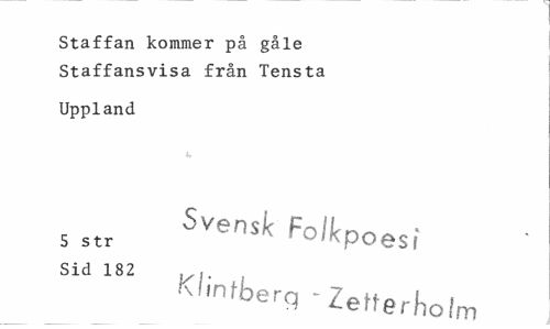 //// Staffan kommer på gåle Staffansvisa från Tensta //// Uppland //// 5 str Svensk Folkpoesi //// Sid 182 //// Kl>"tberq -Zenerholm ////