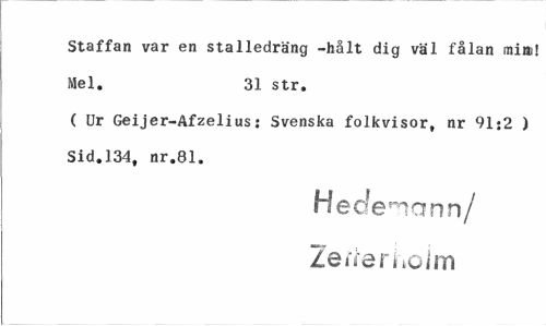 //// Staffan var en stalledräng -hålt dig väl fålan mitt! Mel. 31 str. //// ( Ur Geijer-Afzelius: Svenska folkvisor, nr 91:2 ) Sid.134, nr.81. //// Hedenann/ //// Zerterhoim ////