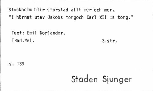 //// Stockholm blir storstad allt mer och mer, "I hörnet utav Jakobs torgoch Carl XII :s torg." //// Text: Emil Norlander. //// TRad.Mel. 3.str. //// s. 139 //// Sloden Sjunger ////