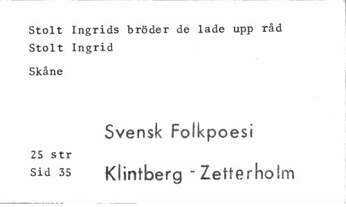 //// Stolt Ingrids bröder de lade upp råd Stolt Ingrid //// Skåne //// Svensk Folkpoesi //// 25 str //// sid 35 Klintberg "Zetterholm ////