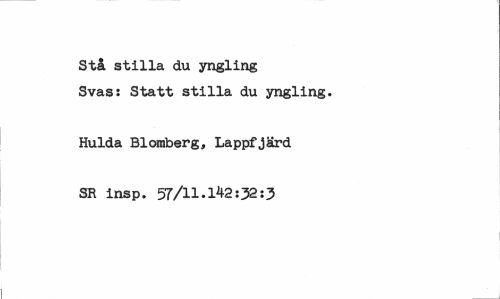 //// Stå stilla du yngling //// Svas: Statt stilla du yngling. //// Hulda Blomberg, Lappfjärd //// SR insp. 57/11.1^2:32:3 ////