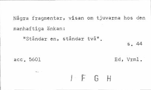 //// Någxa fragmentar, visan om tjuvarna hos den manhaftiga änkan: //// "Ståndar en, ståndar två". //// s. 44 //// acc. 5601 Ed, Vrml. //// I F G H ////