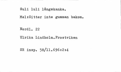 //// Suli luli långskanka. //// MelsSitter inte gumman bakom. //// Nordl. 22 //// Ulrika Lindholm.Frostviken SR insp. 58/11.696:2:4 ////