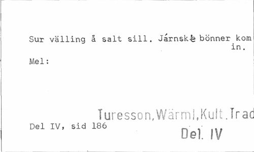 //// Sur välling å salt sill. Jarnsk.% bönner kom //// in. //// Mel: //// Turesson, Wärml, Kult. Tra< //// Del IV, sid 186 - • //// De). IV ////
