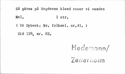 //// Så gärna på ängderna bland rosor vi vandra Mel. 1 str. //// ( Ur Dybeck; Sv. folkmel. nr.41. ) Sid 139, nr. 83. //// Hedern arm/ Zeuai i.olm ////